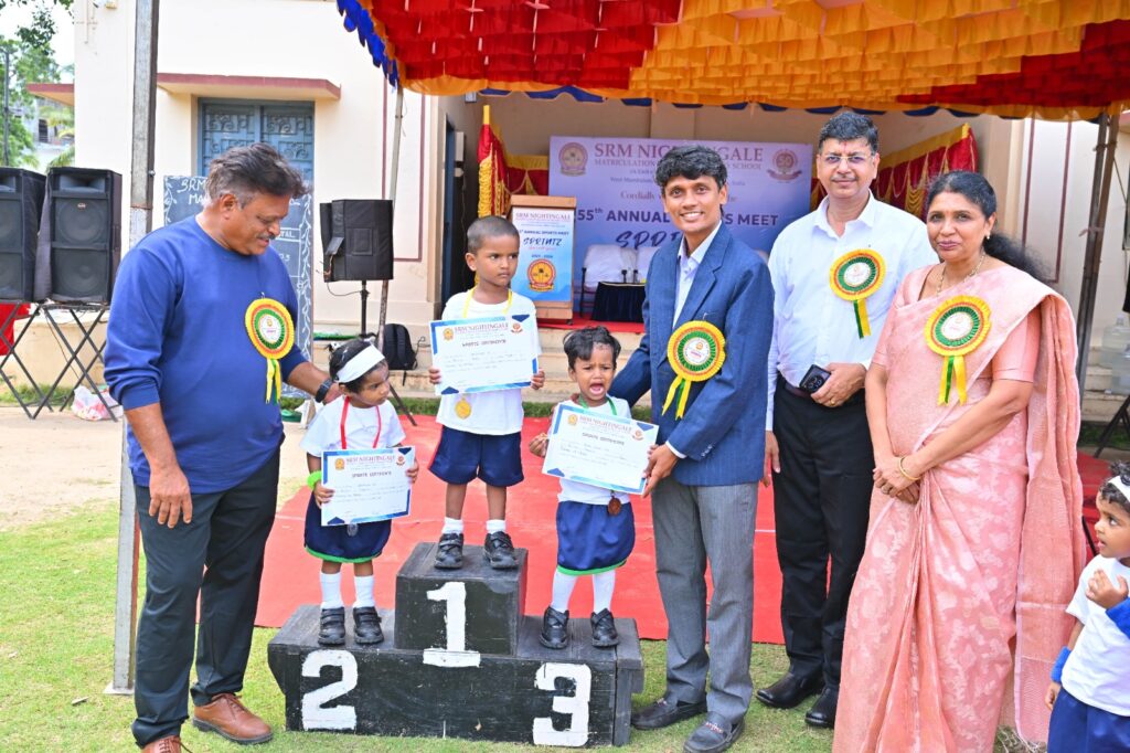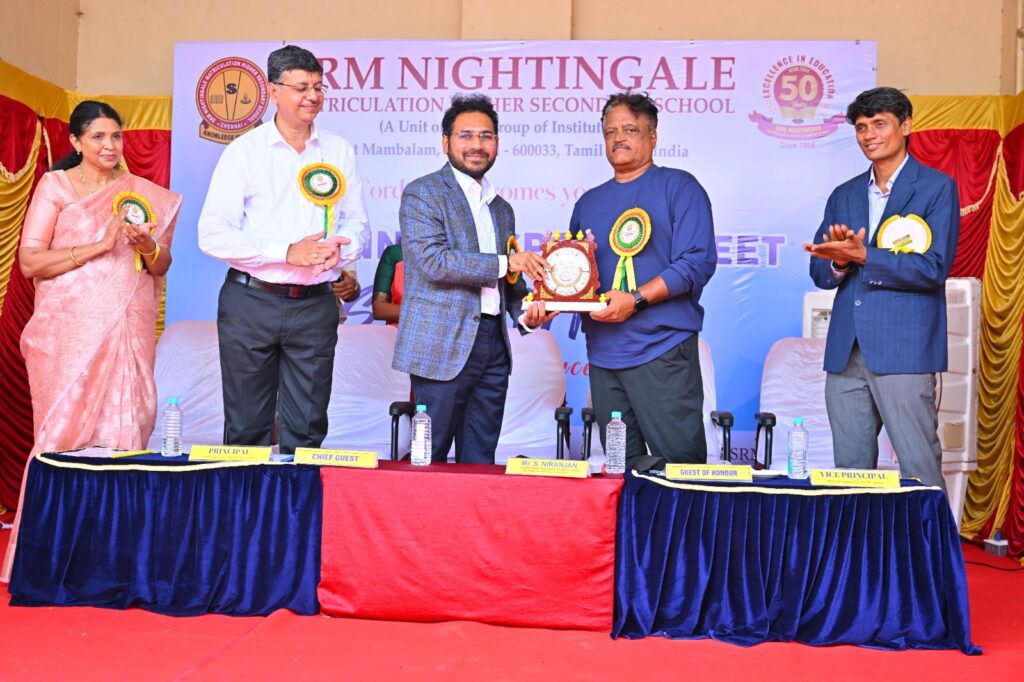 SRM NIGHTINGALE MAT HR SEC School celebrated its 55th Annual Day today with great joy and enthusiasm under the inspiring theme “Sprintz – Race with Grace.” The occasion was graced by the presence of our Chief Guest, Mr. A Venkatesh, CAC Member and Cricket Manager, and our Guest of Honour, Mr. R Ashwin Kumar, an alumnus of the 2003 batch. We were also privileged to have with us our Co-Chairman, Mr. Niranjan of SRM Group of Institutions West Mambalam,Chennai, Ramapuram and Trichy campus. Our Principal, Mr. T Rangarajan, and our Vice Principal, Ms. Selvi Nandakumar, along with our dedicated teachers, supportive parents, and spirited students were gracefully present . The event was well organized and filled with vibrant performances in which students participated enthusiastically. Prizes were distributed to the winners of various events, making the day truly memorable and reflective of the spirit of teamwork, dedication, and excellence that SRM NIGHTINGALE MATRICULATION  HIGHER SECONDARY School stands for.
