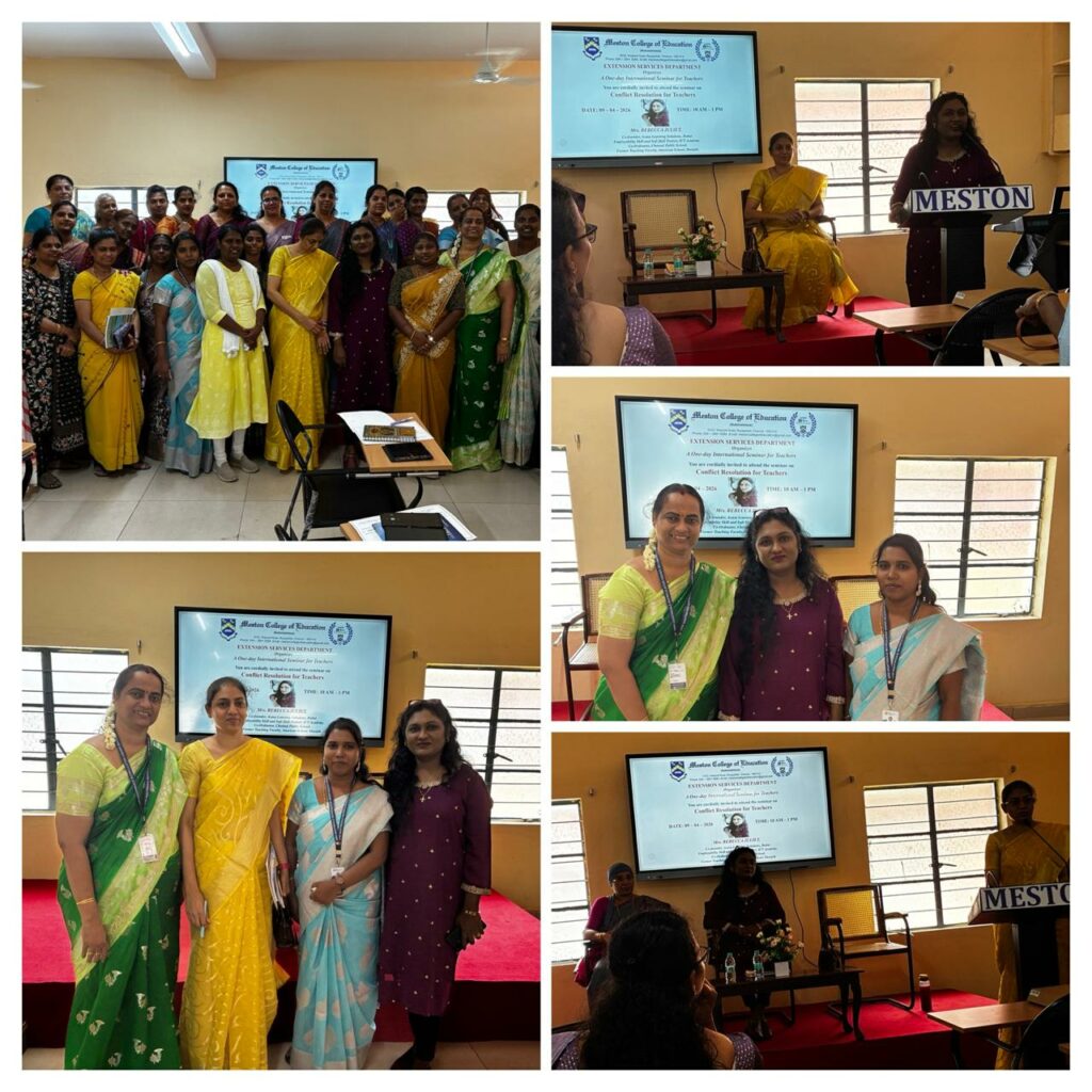 A one-day seminar on “Conflict Resolution” was organized by Meston College of Education, Chennai, on 9th April 2026. Mrs. Yashini and Mrs. Sarasija attended the session led by Mrs. Rebecca Juliet, gaining valuable insights to enhance their teaching practices.